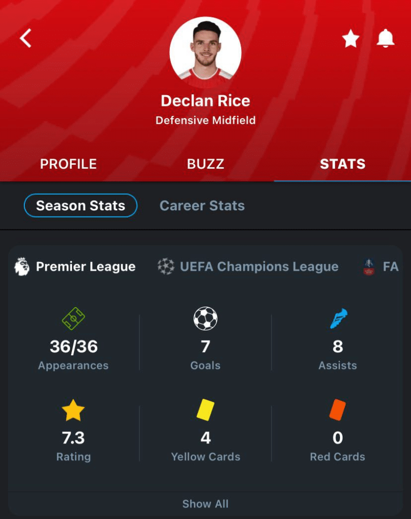 Declan Rice's 365Scores stats card