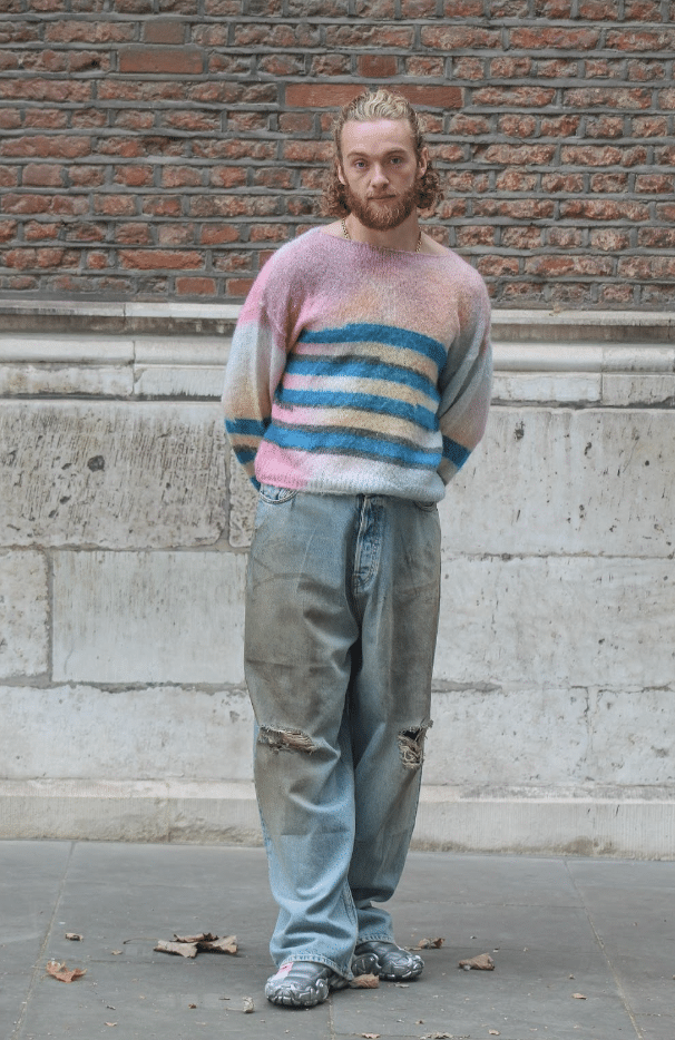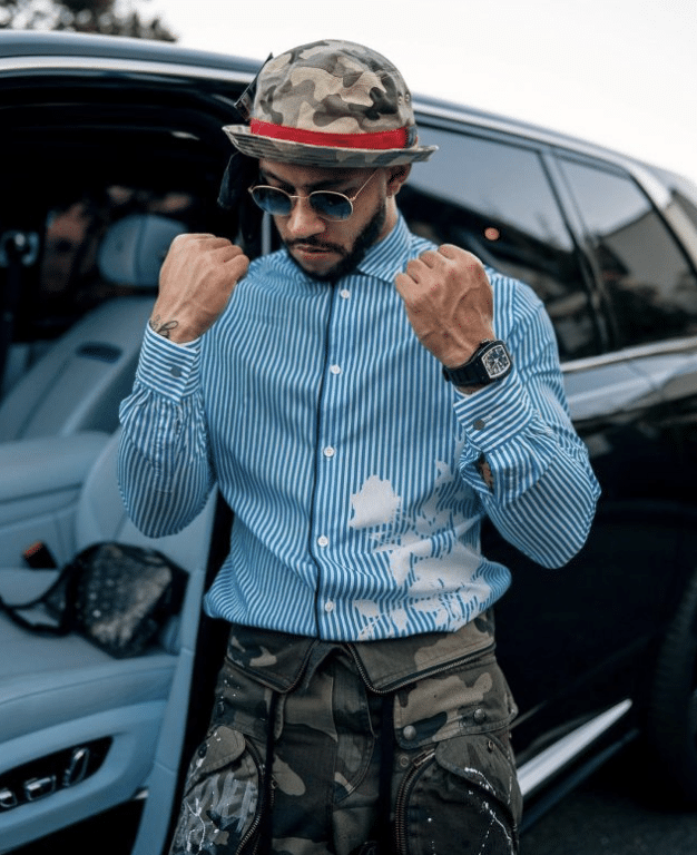 His style often encompasses his profession, mixing football shirts with streetwear items.