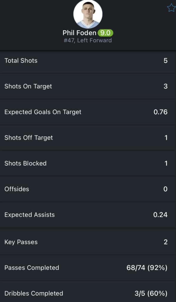 Foden’s dynamic presence was felt throughout the match, evident in his impressive 92% pass accuracy from 74 attempted passes and his successful dribble attempts, winning three out of five. His ability to win ground duels and aerial duels highlights his versatility and effectiveness in both attacking and defensive situations. This season, Foden has elevated his game to another level, consistently delivering standout performances. With his skill set and consistency, Foden has undoubtedly established himself as a world-class talent, crucial to Manchester City’s success.