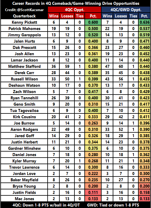 The terrible news for Pittsburgh is Pickett was surprisingly clutch in close games, and Fields is in the running for the worst quarterback in NFL history with the game on the line. Pickett is 7-4 (.636) at game-winning drive opportunities when he had the ball in a tied or one-score deficit game (1-to-8 points) in the fourth quarter or overtime. Fields is just 3-16 (.158) in those situations. Pickett’s record is the best among active quarterbacks (min. 10 games) and Fields’ record is next to last.